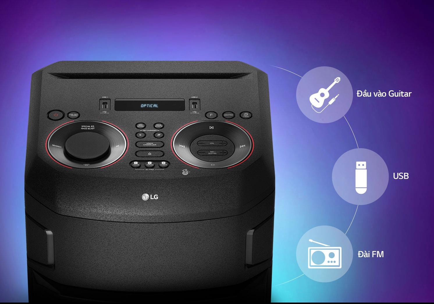 Loa LG có thể ghi lại danh sách nhạc, các bản mix DJ và phát nhạc thông qua USB, đồng thời có thể hỗ trợ chuyển đổi dữ liệu dễ dàng hơn giữa 2 USB với nhau khi được cắm cùng lúc trên loa.